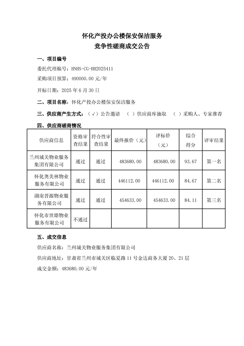 懷化產(chǎn)投辦公樓保安保潔服務(wù)競(jìng)爭(zhēng)性磋商成交公告