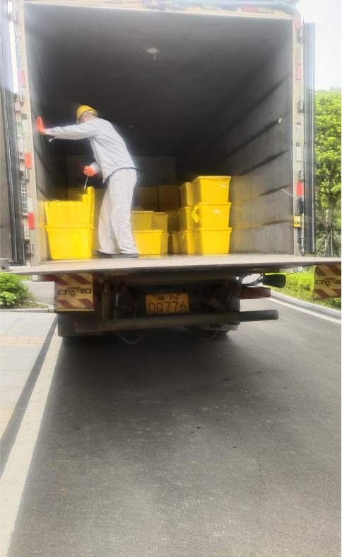 中午時(shí)分,烈日當(dāng)空,收運(yùn)車(chē)箱內(nèi)溫度高達(dá)40多度。穿著防護(hù)服的收運(yùn)人員,汗水止不住地流淌,很快就濕透了衣衫。但他們沒(méi)有半句怨言,“醫(yī)療廢物不能長(zhǎng)時(shí)間存放,必須盡快轉(zhuǎn)運(yùn)處理,我們辛苦點(diǎn)沒(méi)關(guān)系,不能影響城市的安全”。一位年輕的轉(zhuǎn)運(yùn)職工堅(jiān)定地說(shuō)。